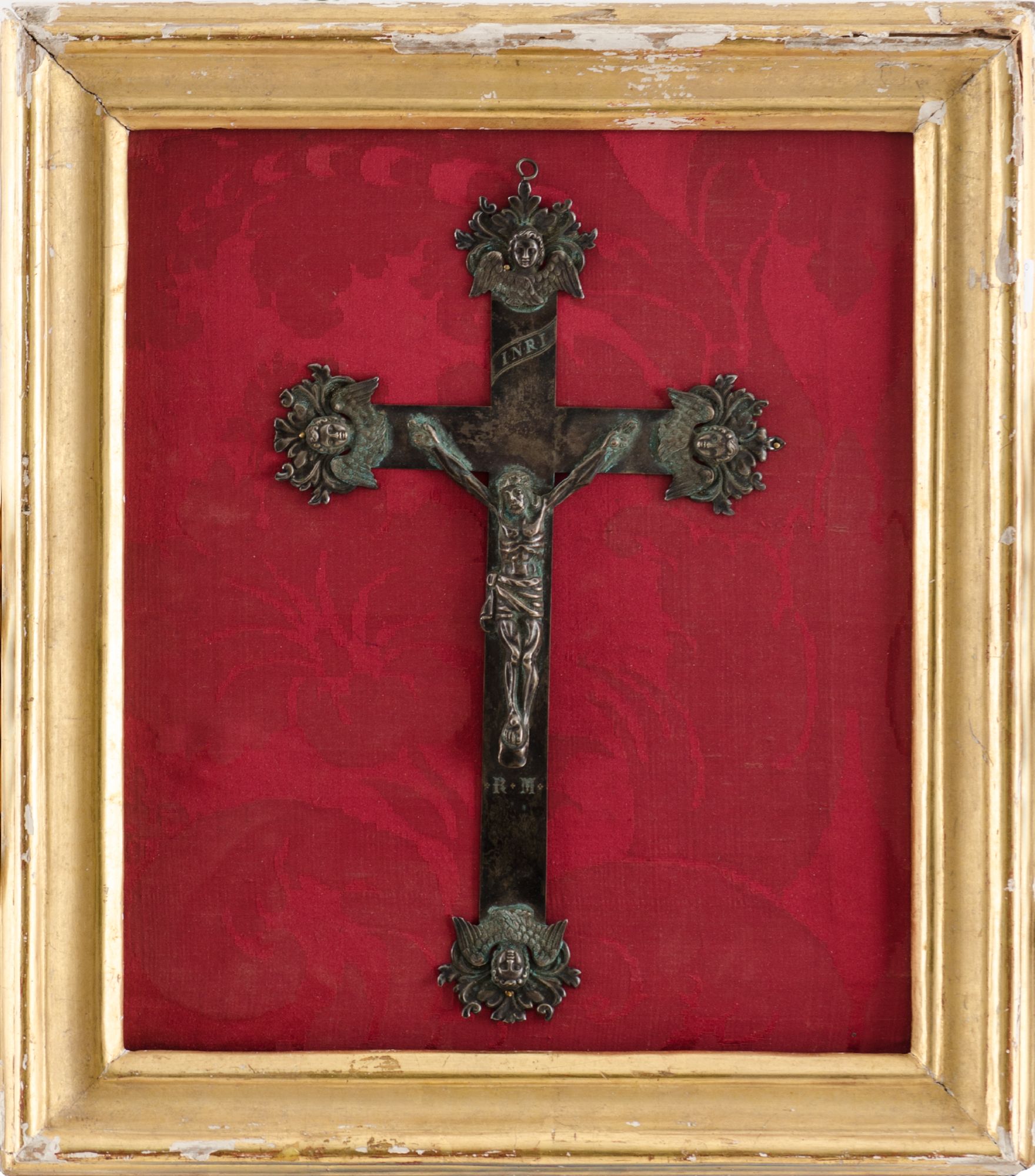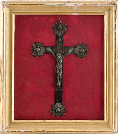 CRISTO con CROCE in argento entro cornice in legno dorato. Sicilia XIX secolo Misure: cm 49 x 42
