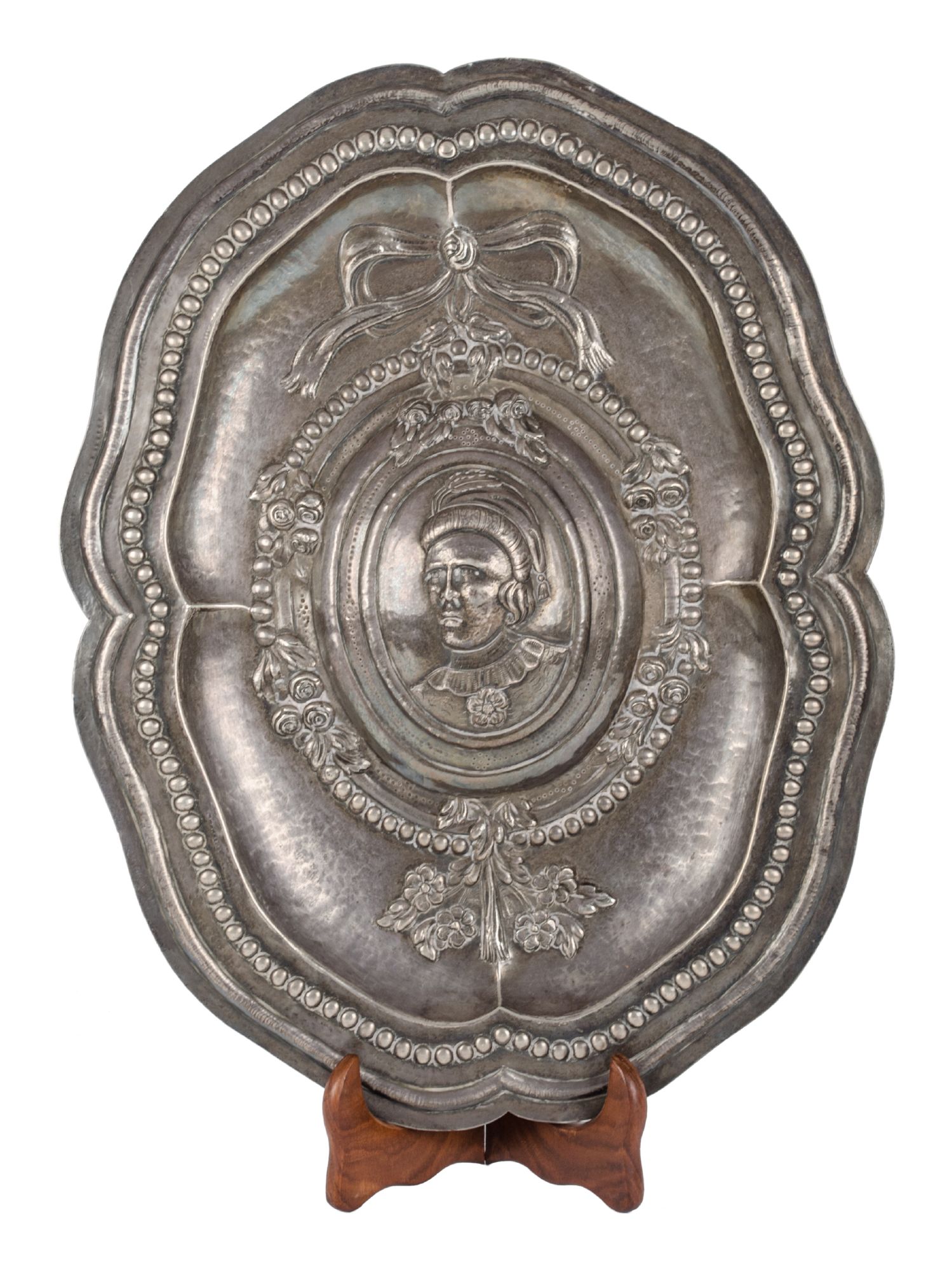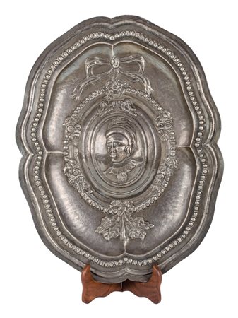 PIATTO in argento di forma sagomata lavorata e sbalzata a mano, al centro presenta profilo maschile nobiliare. Sicilia XVIII secolo Misure: cm 45 x 35