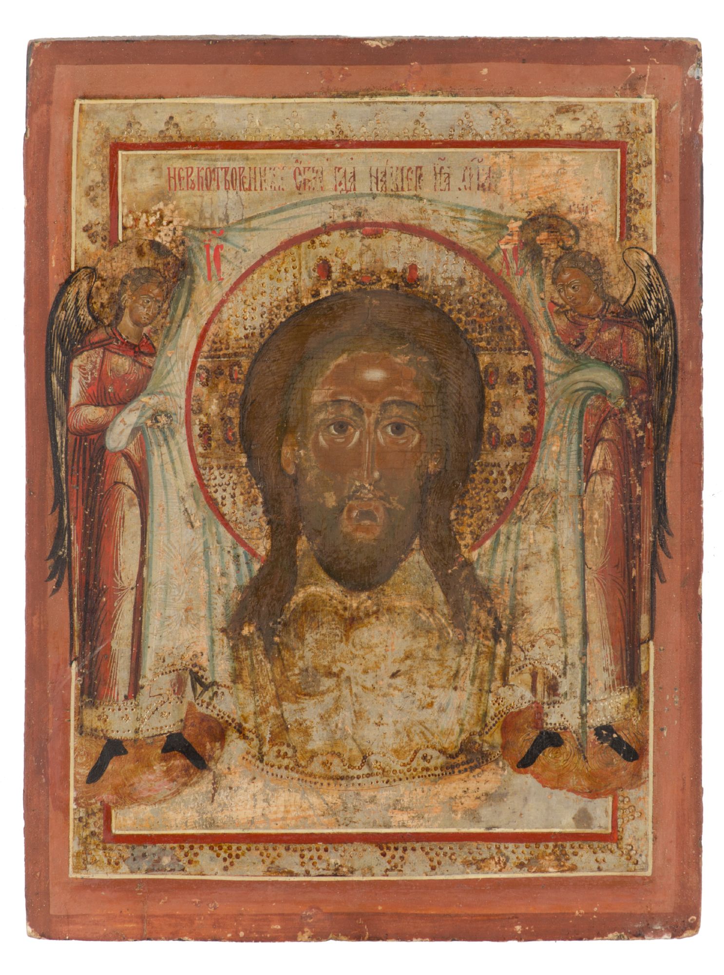 ICONA a fondo oro dipinta a mano "volto di Cristo". Russia XVIII secolo Misure: cm 35 x 27