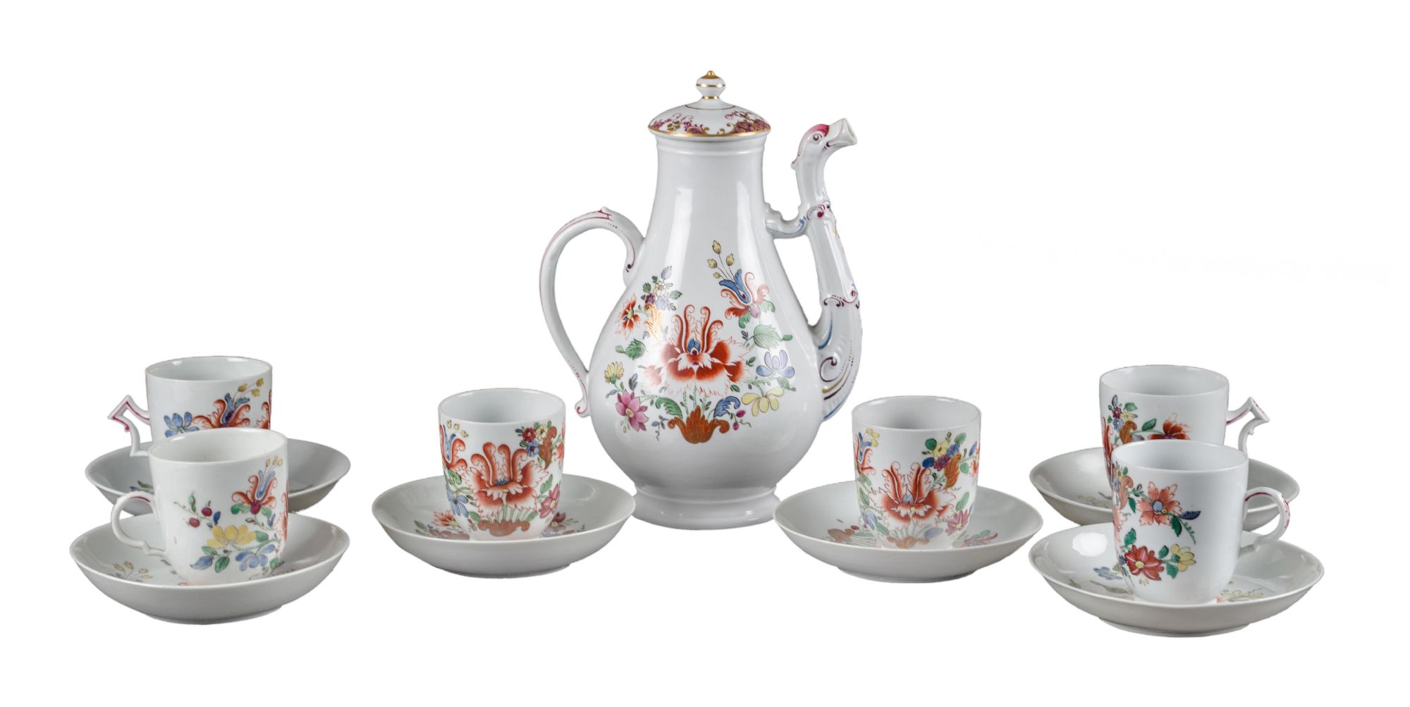 LOTTO composto da CAFFETTIERA e da sei TAZZINE con piattini in porcellana decorata a motivo floreale. XVIII secolo Misure: varie