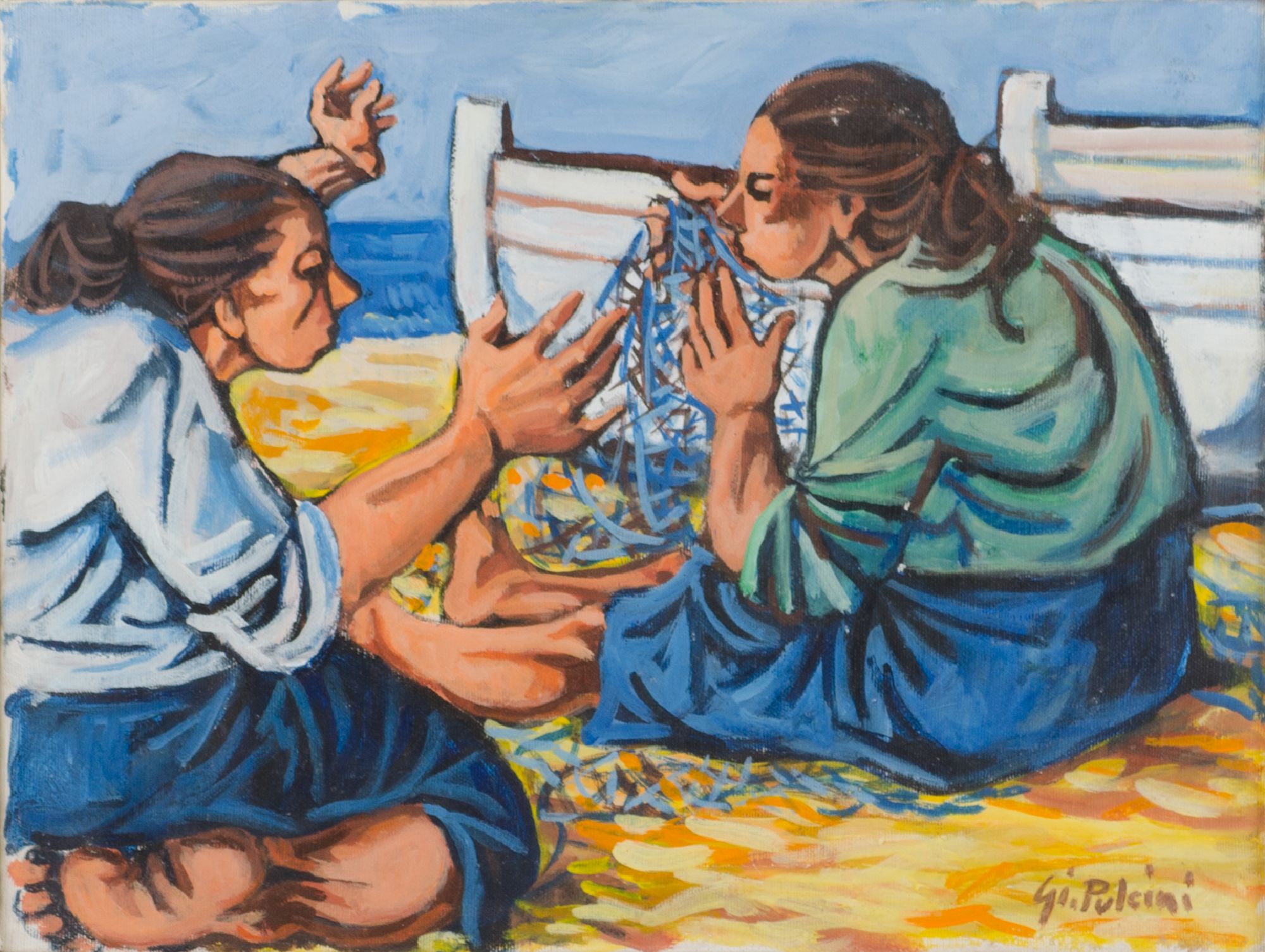 GIULIANO PULCINI OLIO su tela "pescatori", firmato in basso a destra (con certificato di garanzia ed autenticita' della Galleria Romana Arte Davide di Roma). Datato 1983 Misure: cm 30 x 40