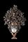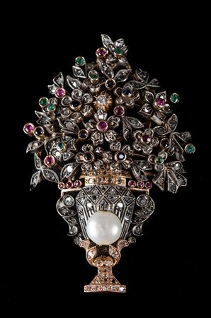 BELLA SPILLA a guisa di vaso con fiori in oro 14 Kt e coppella con rubini, smeraldi, zaffiri, diamanti rose corone' e perla mabe'. Anni '70