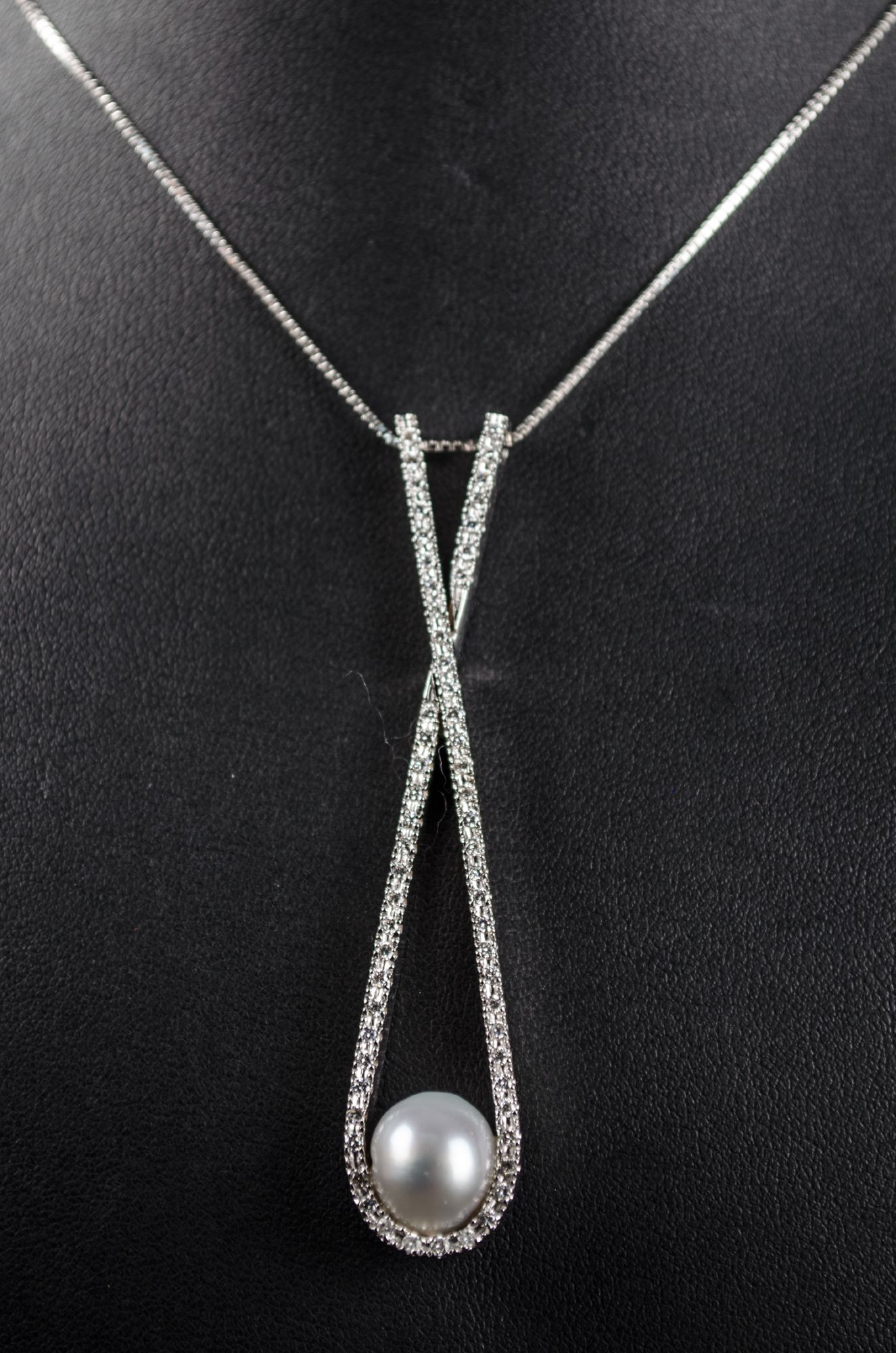 COLLIER in oro bianco 18 Kt. con brillanti (Ct. 0.60) e perla australiana (Ct. 14) (g. 18.90).
