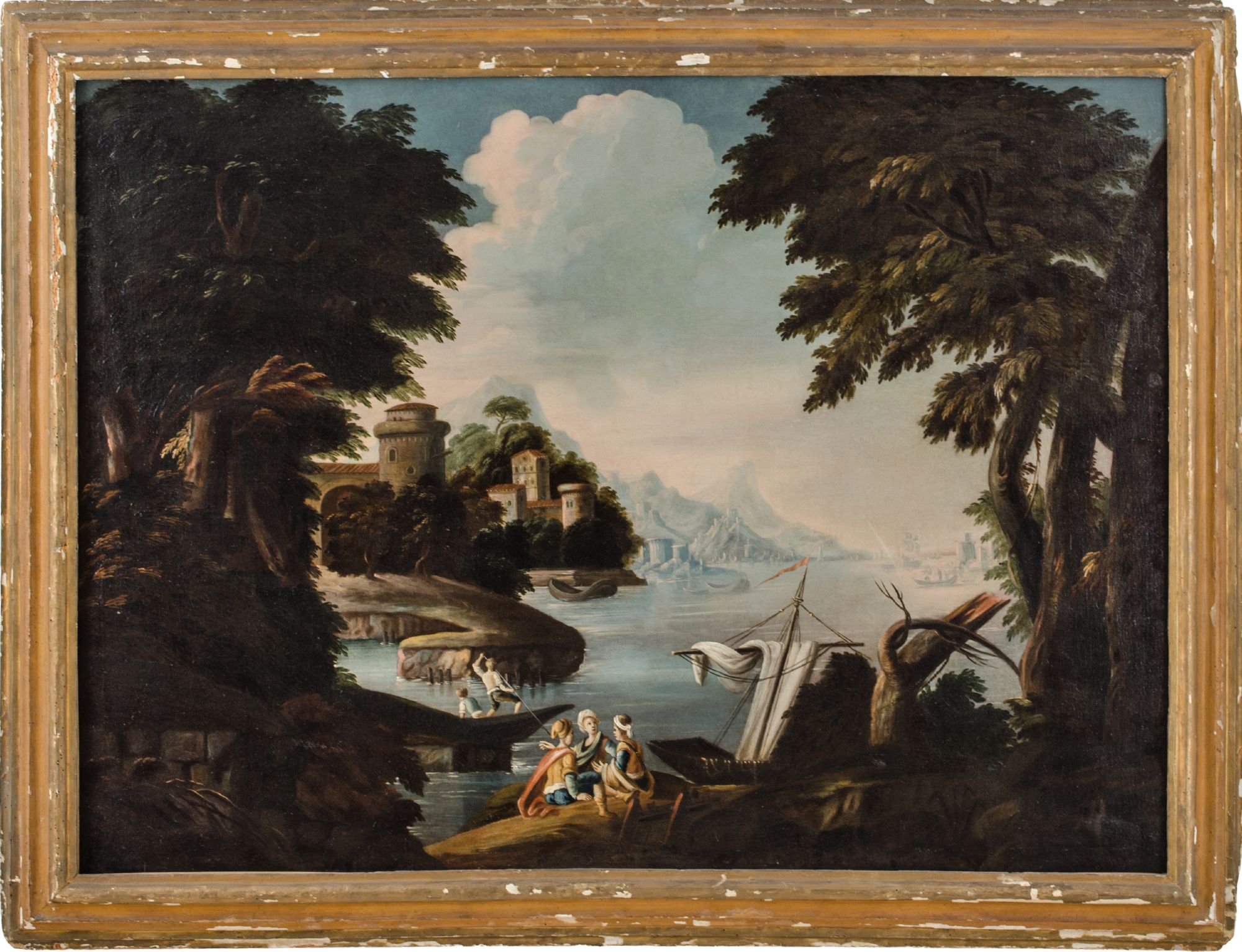 OLIO su tela raffigurante "paesaggio marino con castello". Italia centrale XVIII secolo Misure: cm 136 x 100