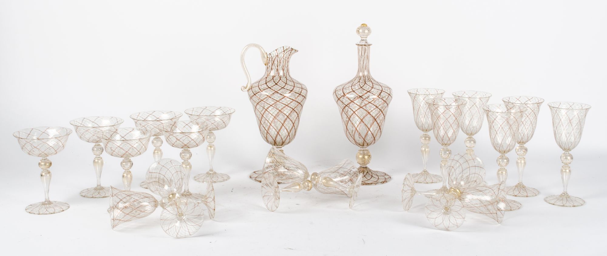 SERVIZIO BICCHIERI in vetro Murano composto da BROCCA, BOTTIGLIA, 6 BICCHIERI per acqua, 6 BICCHIERI per vino e da 6 COPPETTE. XX secolo