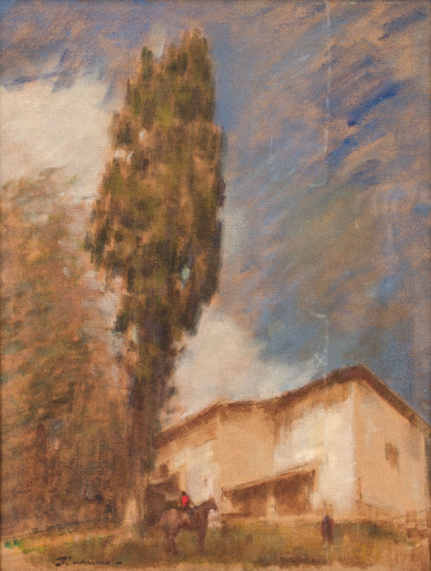 ANTONIO GUARINO (Sambusa di Sicilia (Ag) 1882 - Roma 1969) OLIO su masonite "casolare". Misure: cm 64 x 48,5