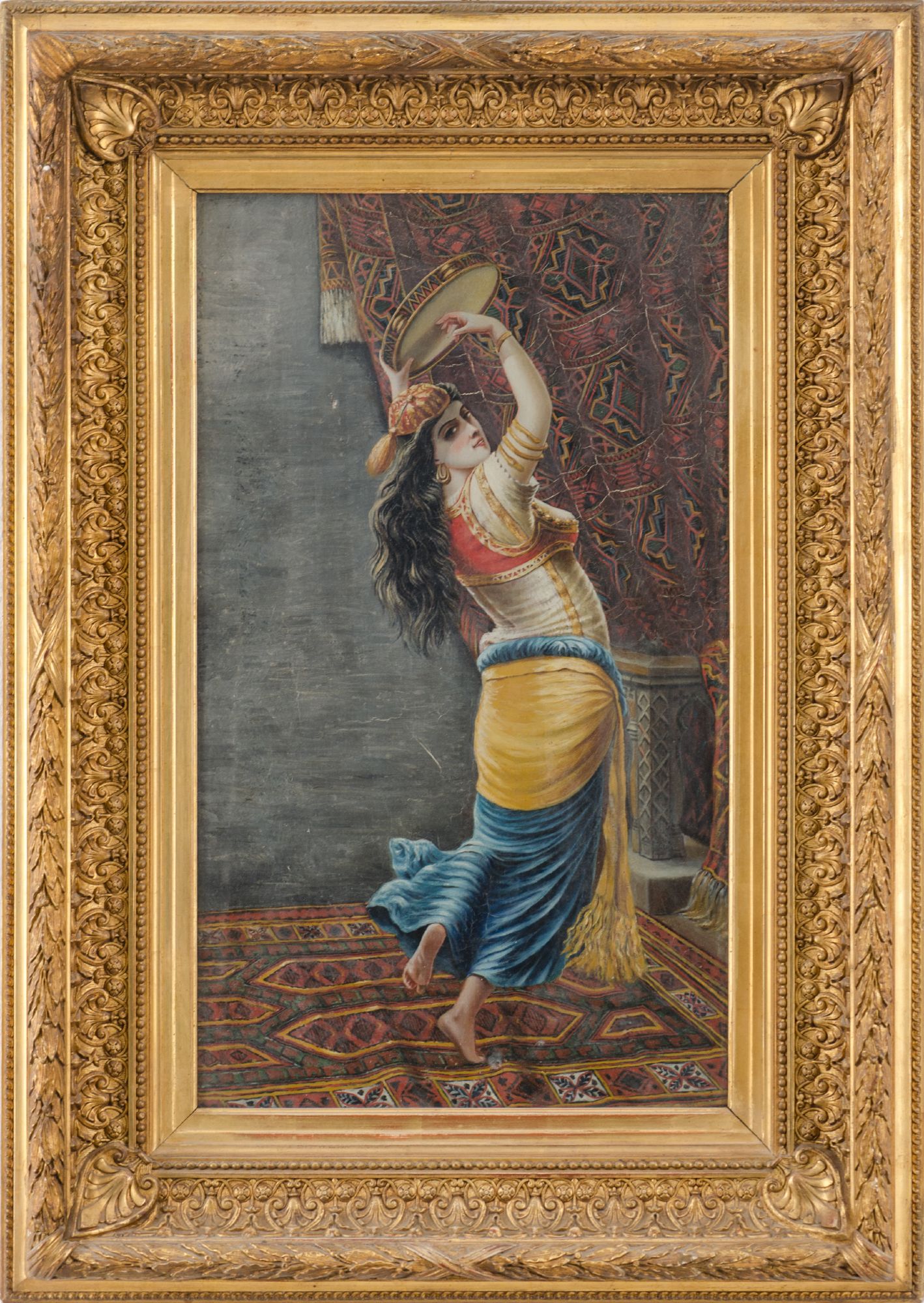 OLIO su tela "figura femminile orientale" entro bella cornice in legno e pastiglia dorata. XIX secolo Misure: cm 60 x 35