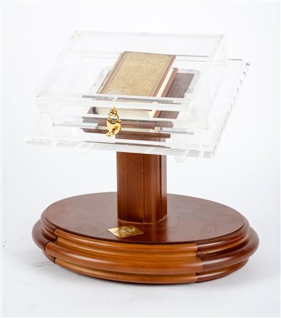 VOLUME "Il cammino dell'Uomo" costituito da 56 pagine in carta fabbricata a mano e da 20 lamine d'oro (24 Kt.) da 2 gr. ciascuna, rilegatura in pelle con incisioni a sbalza decorate a mano con foglie d'oro zecchino entro espositore in legno e plexiglass. XX secolo Misure: cm 36 x 28 x h 35