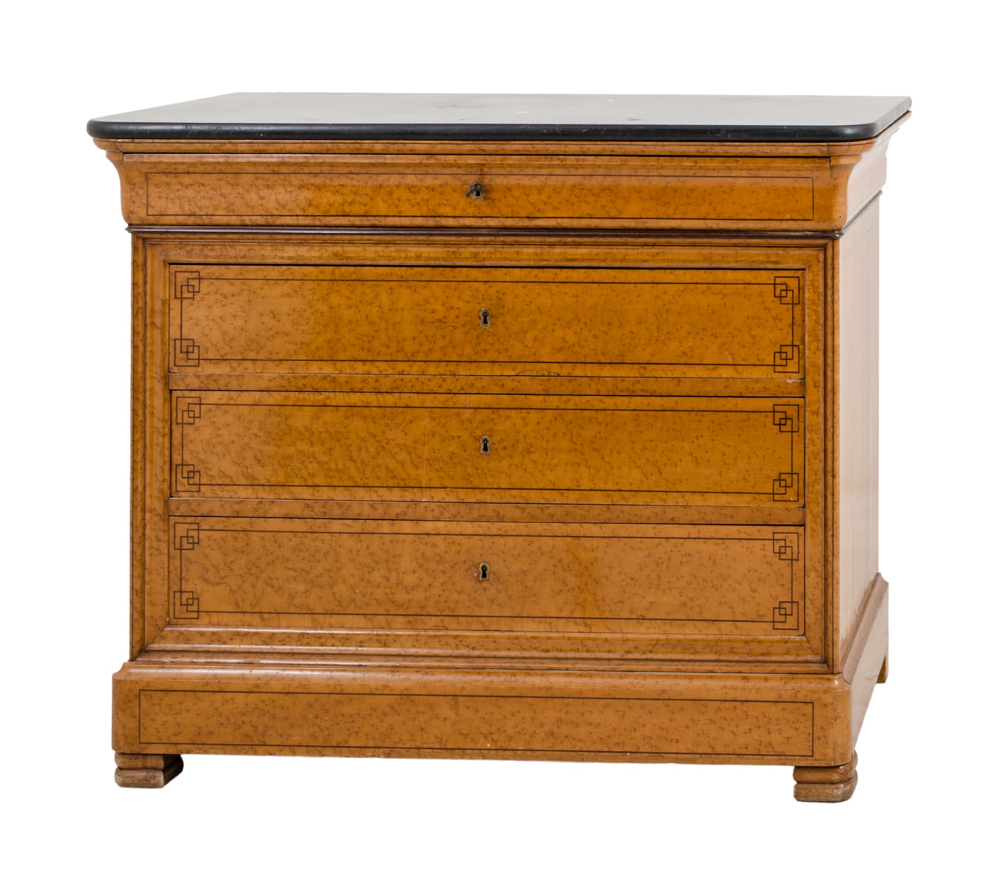 CASSETTONE Carlo X a quattro cassetti più cassetto segreto in radica di tuja con perfili in palissandro, piano in marmo nero belga. Francia primi '800 Misure: cm 128 x 59 x h 96
