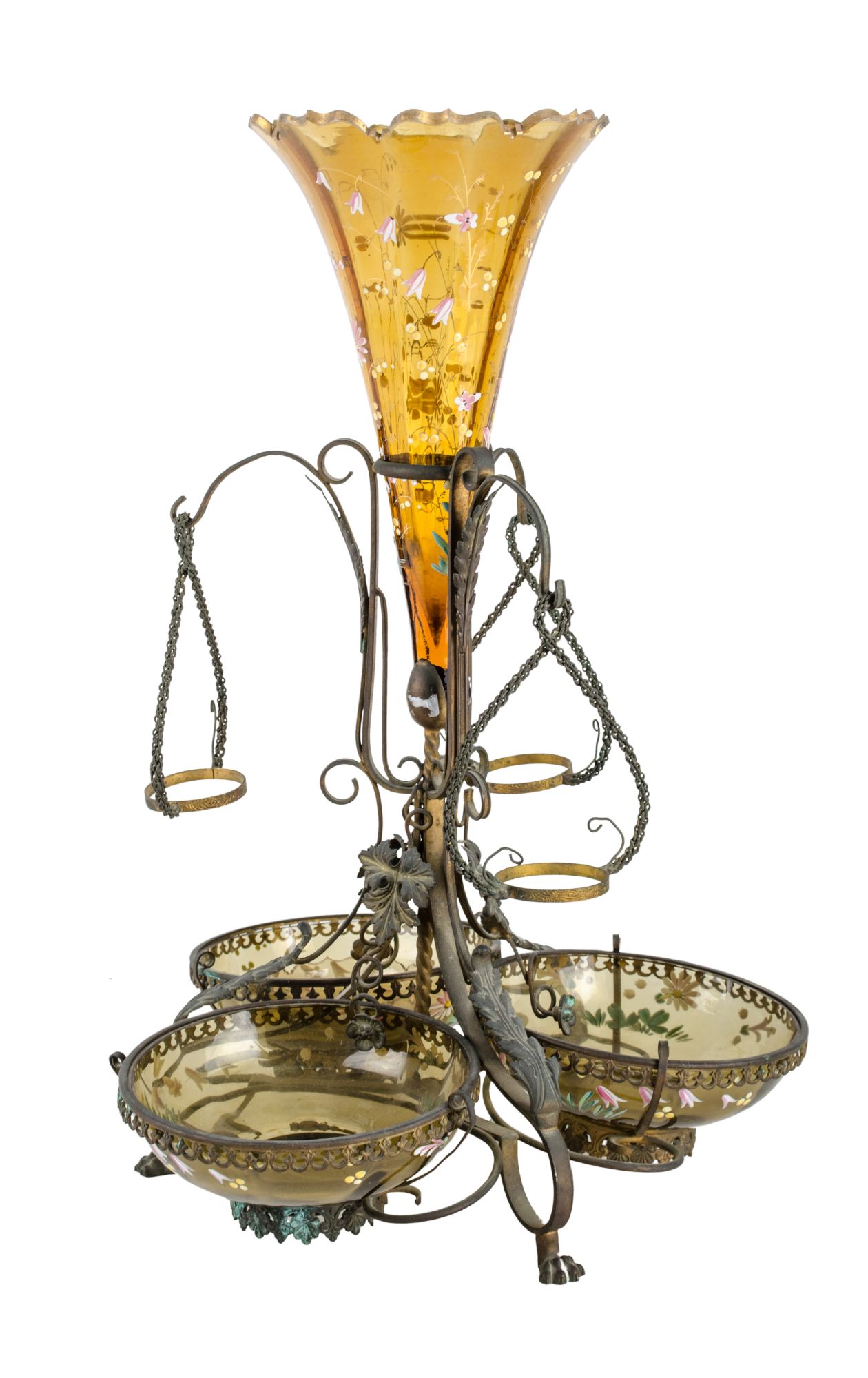 FIORIERA in ottone e vetro dipinto a mano. Sicilia primi '900 Misure: h cm 54