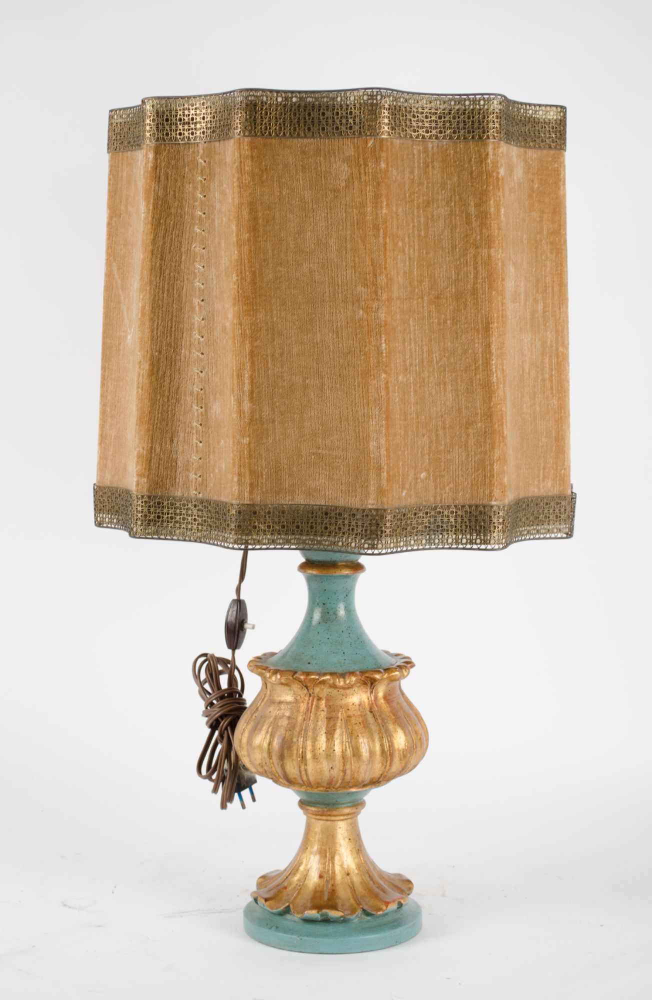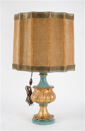LOTTO composto da LUME in opaline con paralume verde e da LUME in legno laccato con paralume color avorio. Italia XX secolo Misure: h cm 49