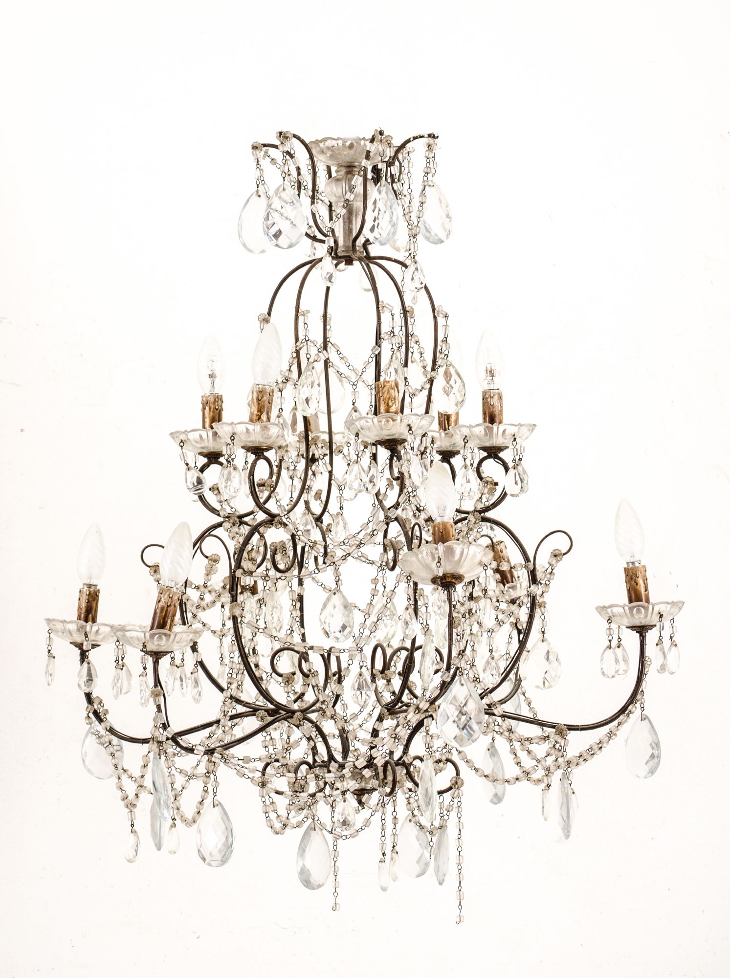 LAMPADARIO a dieci luci in ferro e brindoli. Primi '900 Misure: h cm 90