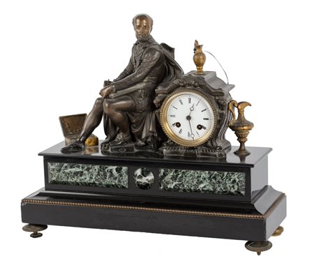 OROLOGIO in bronzo ed antimonio con base in vari marmi. Italia XX secolo...
