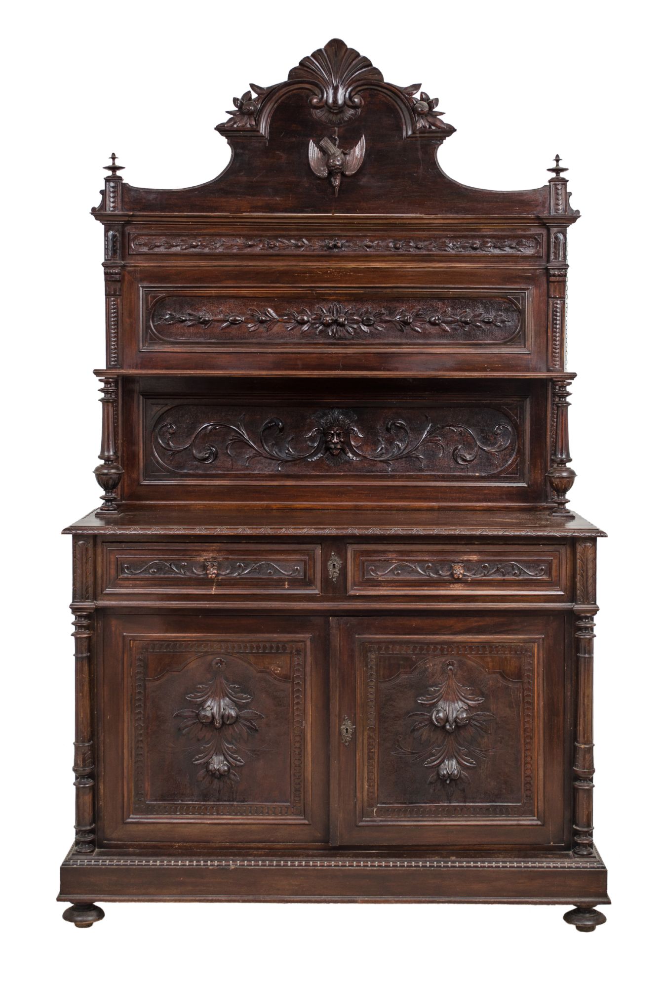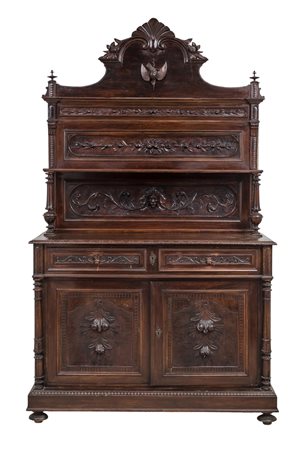 CREDENZA a due ante con alzata stile Umbertino in noce. Sicilia fine '800...