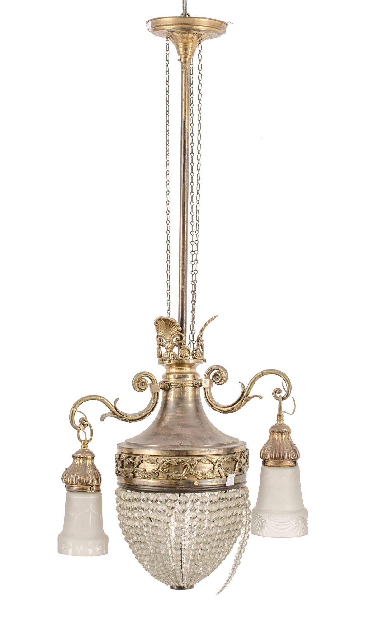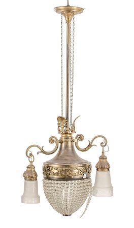 LAMPADARIO Liberty a tre luci in ottone con brindoli. Sicilia primi '900...