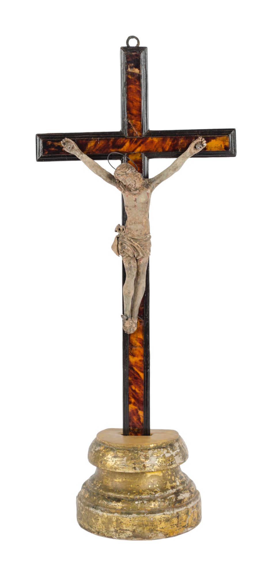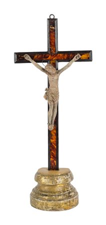 CRISTO in terracotta (h cm 19) con croce in tartaruga e base in legno dorato. Fine '700 Misure: h cm 47