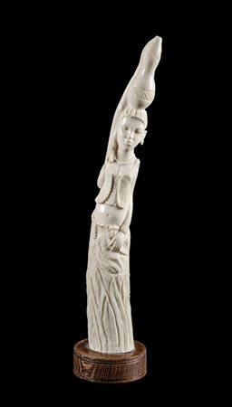 SCULTURA in avorio africano raffigurante "figura femminile", base in legno. XX secolo Misure: h cm 36,5