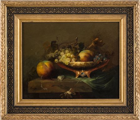 OLIO su tavoletta "natura morta" firmato in basso a destra entro cornice in legno e pastiglia dorata ed in parte ebanizzato. Primi '900 Misure: cm 30 x 40