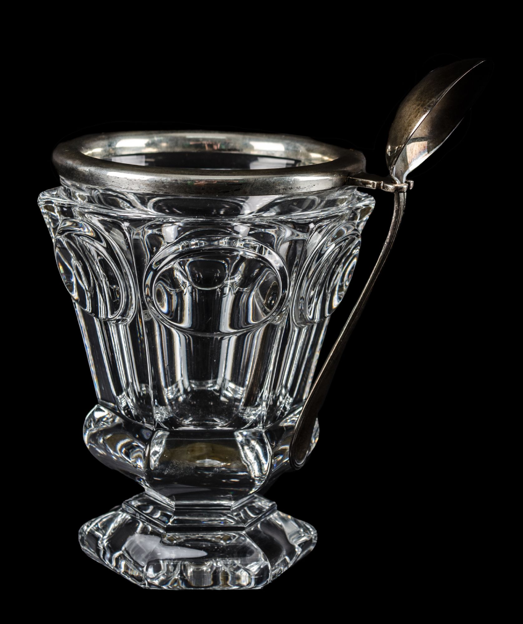 PORTACILIEGIE in cristallo Baccarat con bordura e cucchiaino in argento. XX secolo Misure: h cm 13