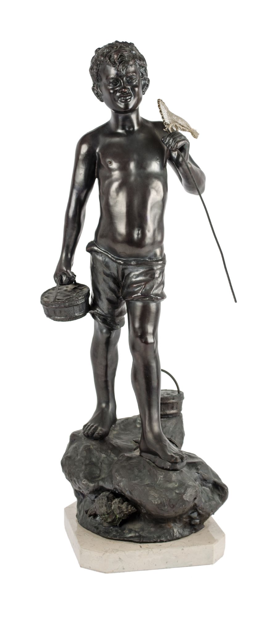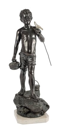 SCULTURA in antimonio "scugnizzo", base in marmo. XX secolo Misure: h cm 72