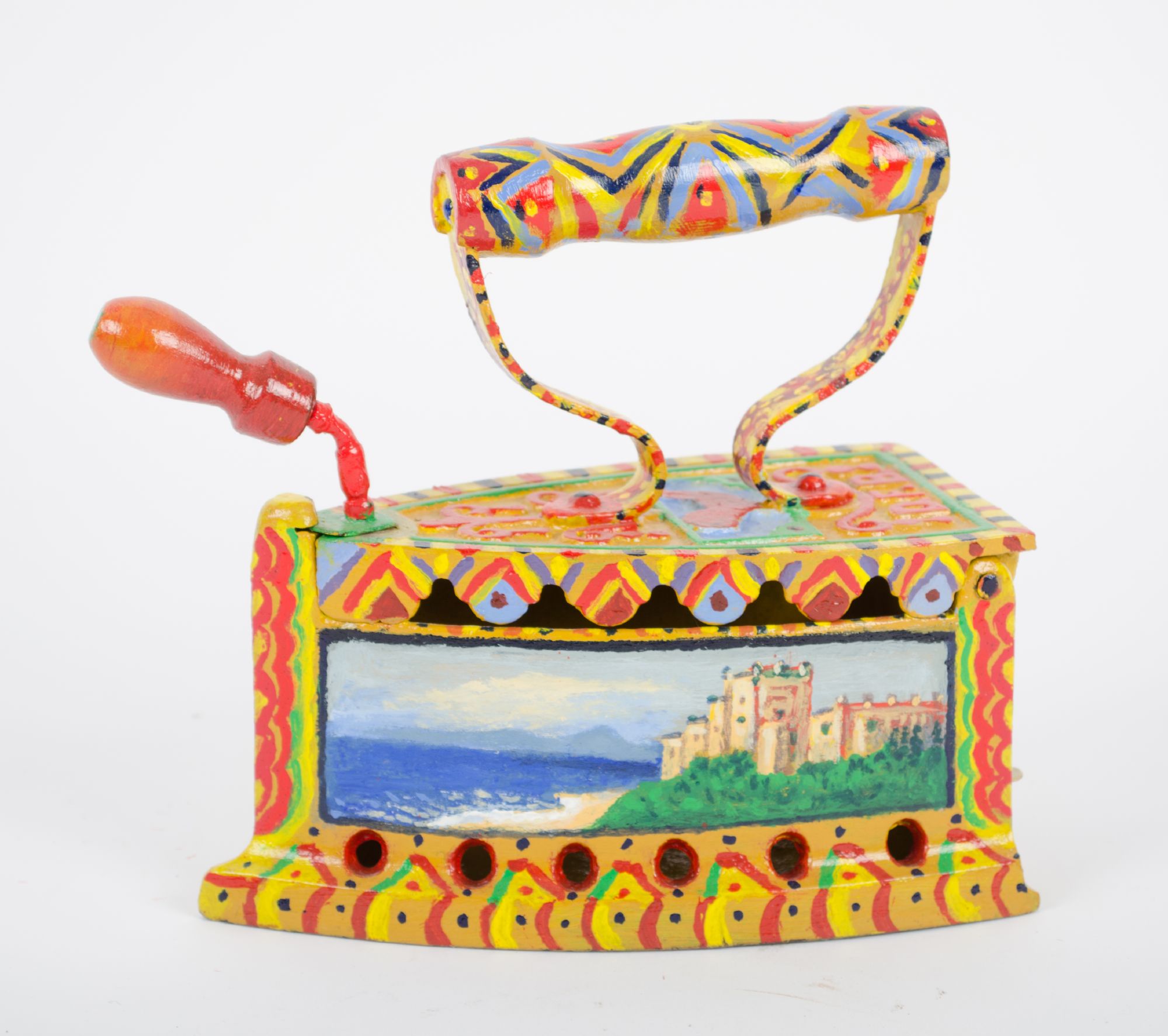 SALVATORE CALO' (Palermo 1950) FERRO da stiro dipinto a motivo dicarretto siciliano. Misure: cm 22 x 10 x h 18