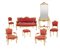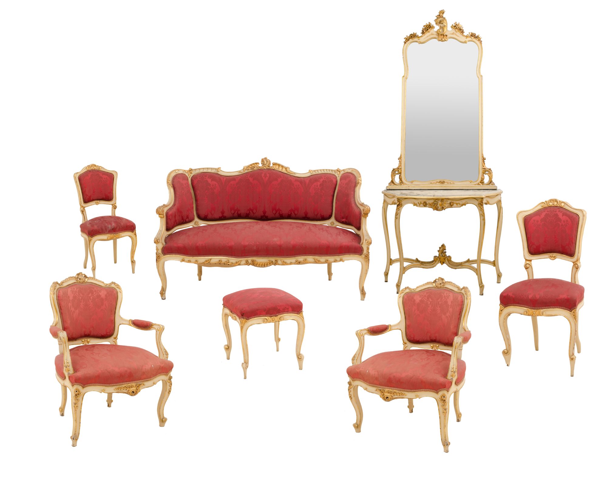 SALOTTO stile Luigi XV in legno laccato e dorato con tappezzeria in stoffa rossa damascata composto da DIVANO, due POLTRONE, POUFF, due SEDIE e da CONSOLE con specchiera. Sicilia primi '900 Misure: varie