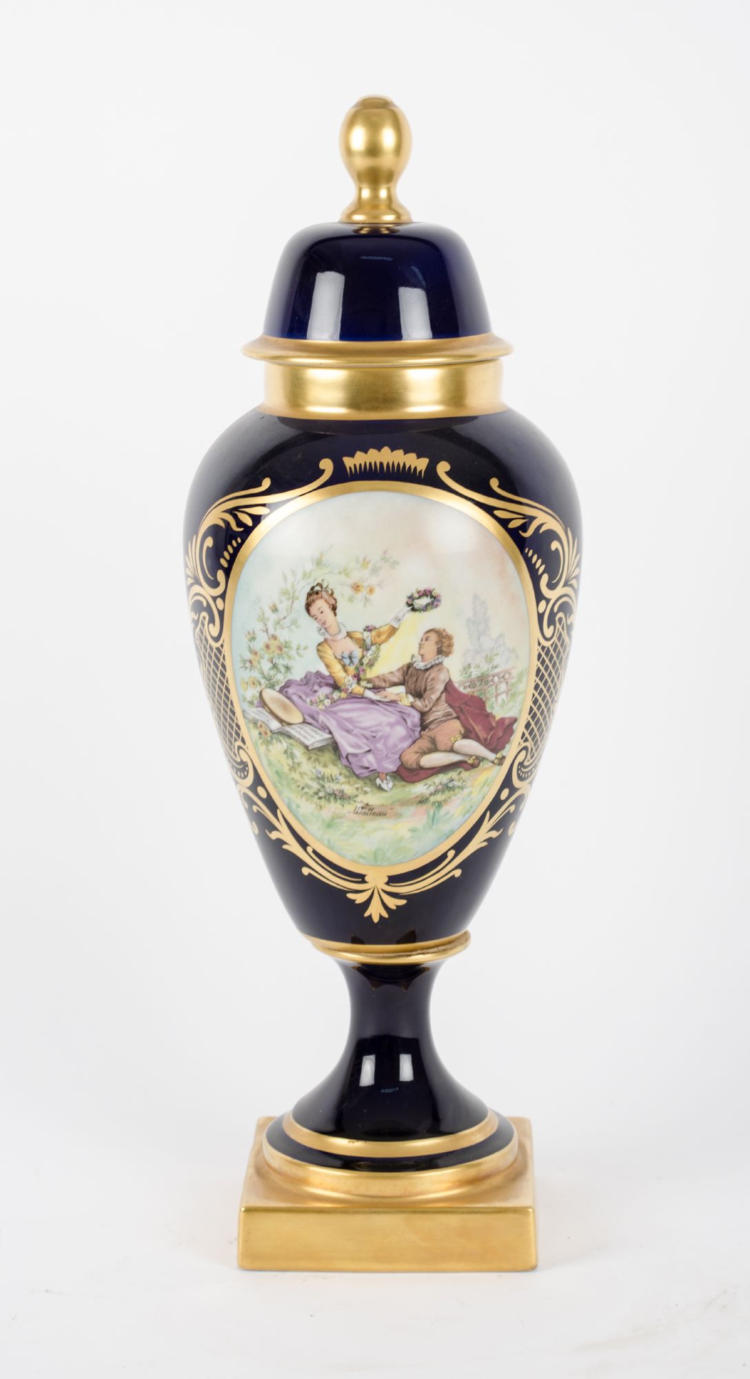 POTICHE in porcellana Limoges con medaglione centrale stampigliato raffigurante "scena galante". XX secolo Misure: h cm 48
