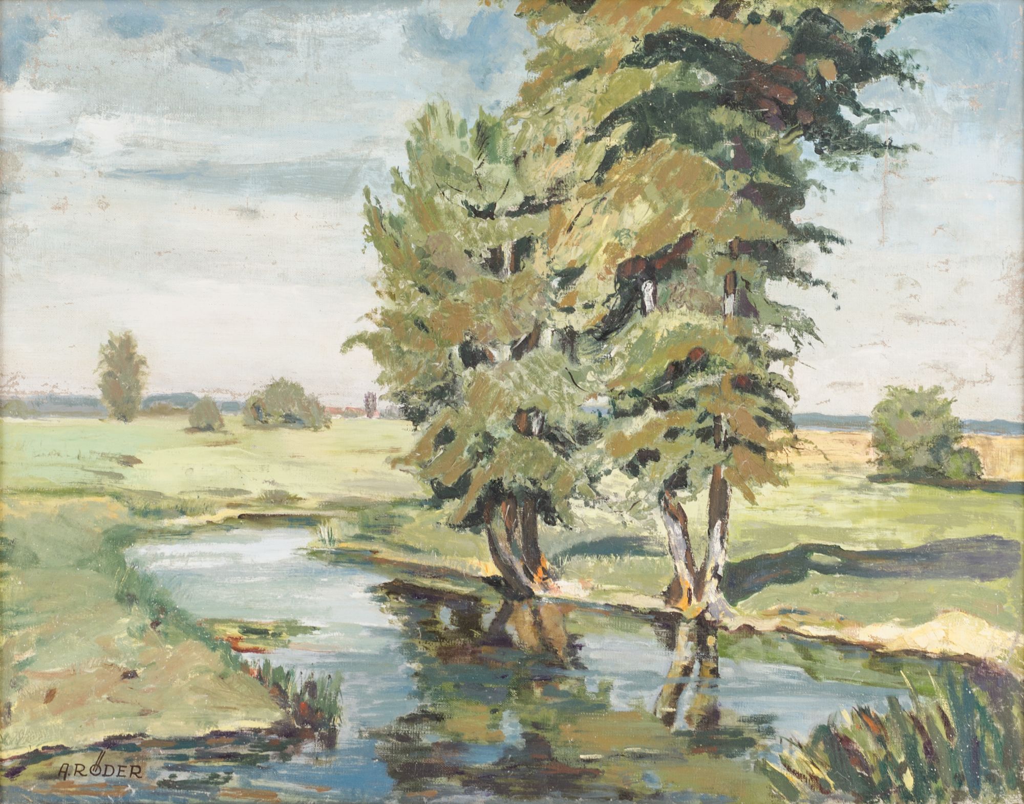 A. RODER OLIO su tela applicato su tavoletta "paesaggio", firmato in basso a sinistra. XX secolo Misure: cm 57 x 72