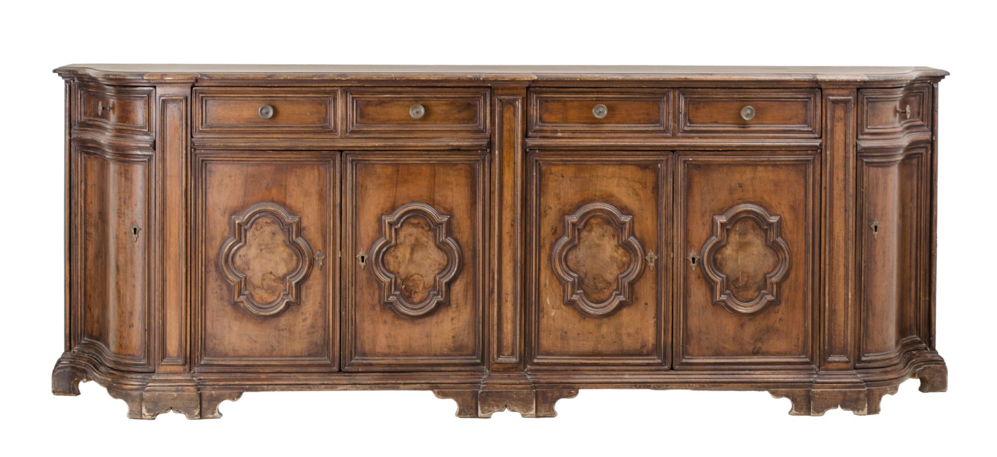 CREDENZA a sei ante in noce e radica di noce. Italia XX secolo Misure: cm 253 x 51 x h 93