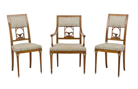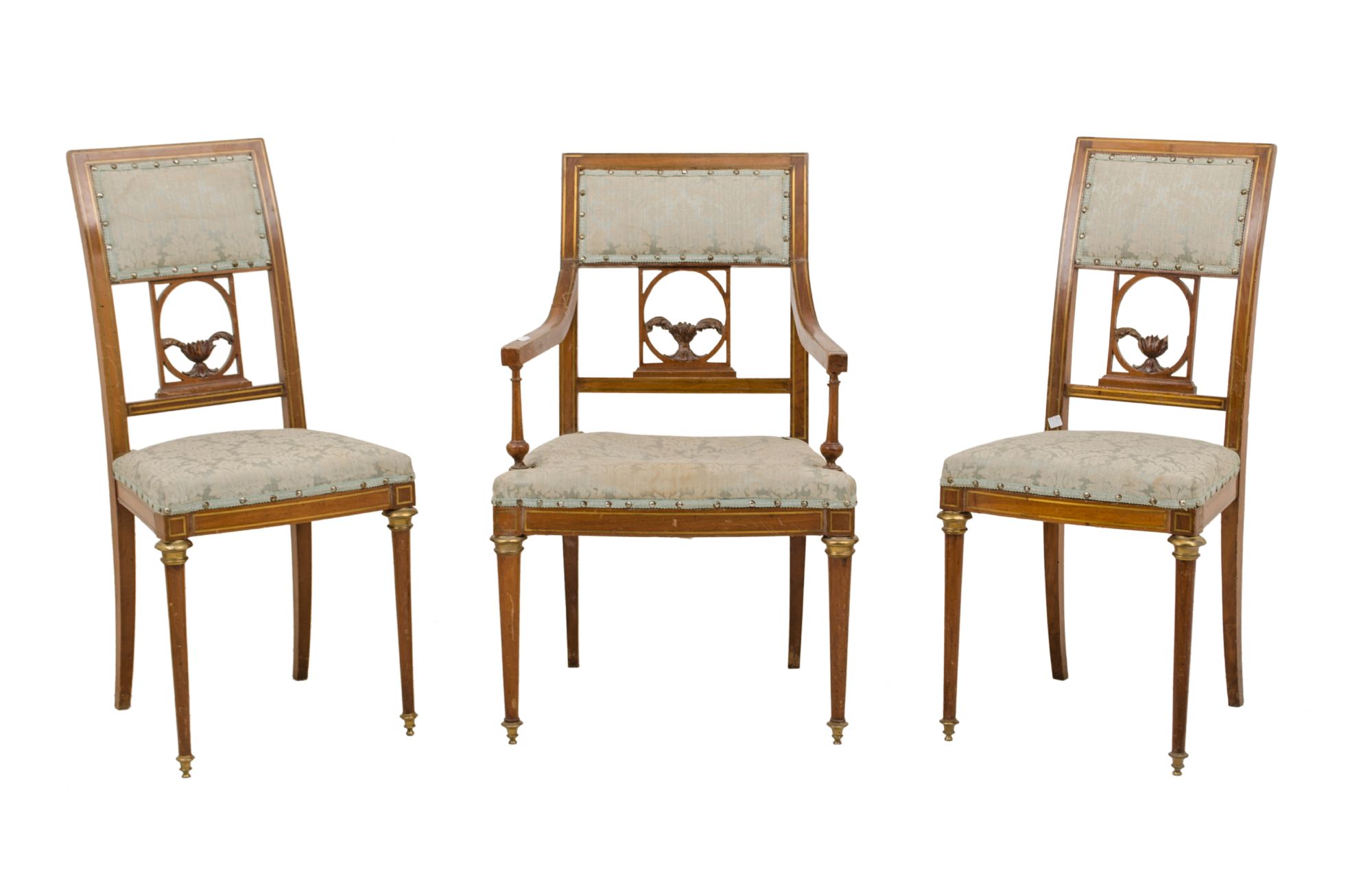 POLTRONA E SEDIA in mogano con tarsie in rame. Primi '900 Misure: varie