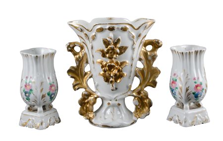 TRE VASETTI Luigi Filippo in porcellana nei toni del bianco con lumeggiatura in oro. Francia XIX secolo Misure: varie