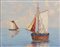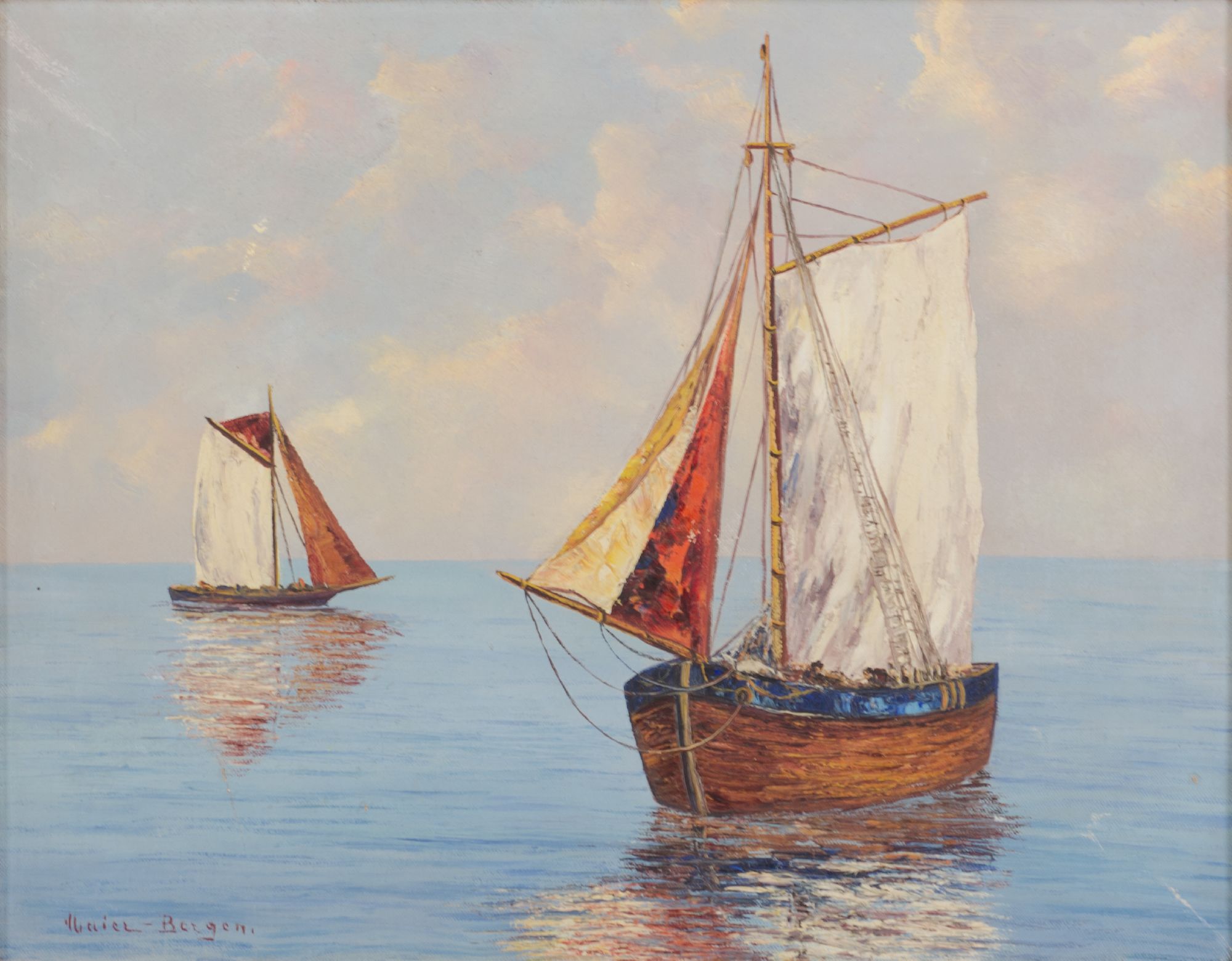 MAIER BERGEN OLIO su masonIte "paesaggio marino con barche", firmato in basso a sinistra. XX secolo Misure: cm 46 x 60