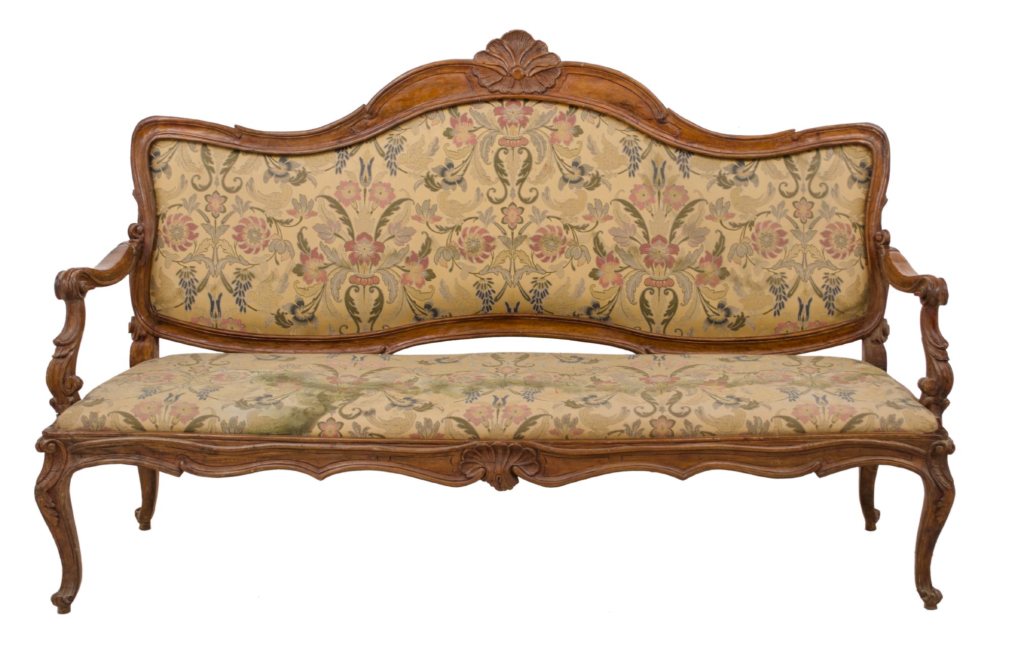 DIVANETTO Luigi Filippo in noce con tappezzeria a motivo floreale (usure). XIX secolo Misure: cm 182 x 62 x h 110