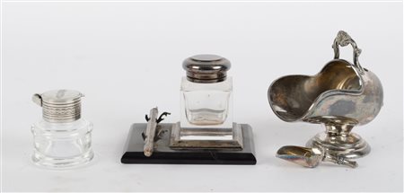 LOTTO composto da CALAMAIERA, BOCCETTINA in vetro e da ZUCCHERIERA con cucchiaino in metallo argentato. XX secolo Misure: varie
