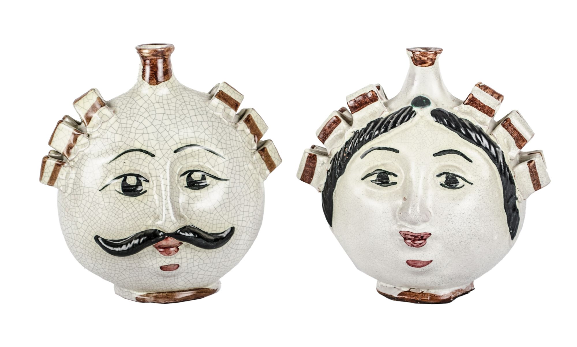 COPPIA BOTTIGLIE in terracotta a guisa di volti. XX secolo Misure: h cm 20,5