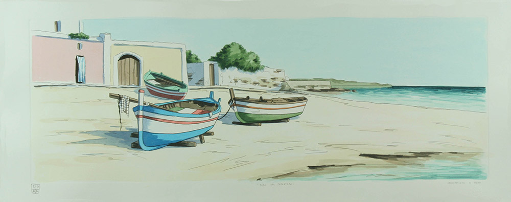Aldo Riso incisione acquerellata a mano "Casa del pescatore", cm 35x100 F.to in b a sx Incisione acquerellata a mano dal maestro
