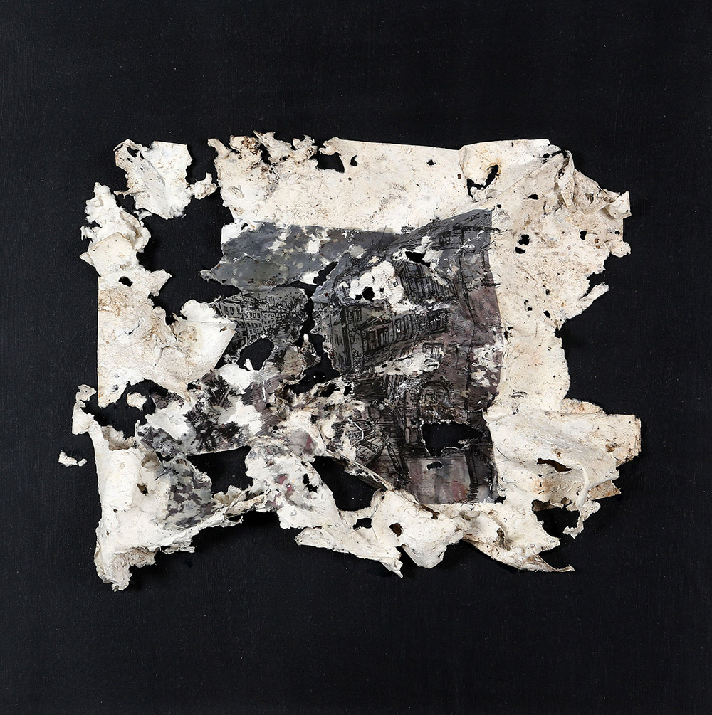 SEBASTIANO BALBO 1956 Rianimazioni, 2011 Grafica di artista anonimo lacerata applicata su tela, cm. 50 x 50 x 8 Firmato e datato sul retro Timbro dell'artista sul retro Prov. Collezione Privata