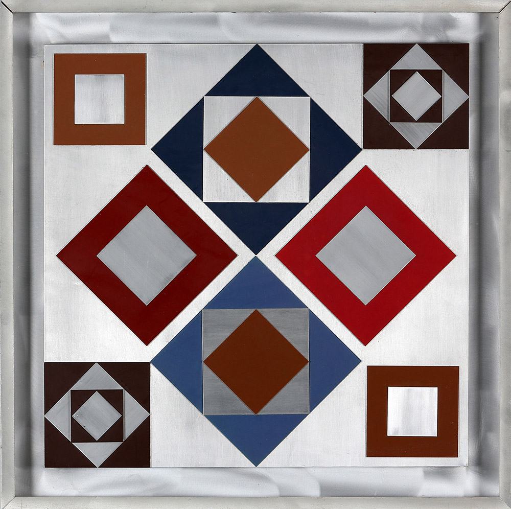 ENZO CACCIOLA 1945 10 agosto 1971, 1971 Smalto su alluminio in rilievo, cm. 84 x 84 Firmato e datato sul retro Etichetta Katia srl Genova sul retro Timbro Galleria La Bertesca Genova sul retro Autentica dell'artista su fotografia Prov. Collezione Privata