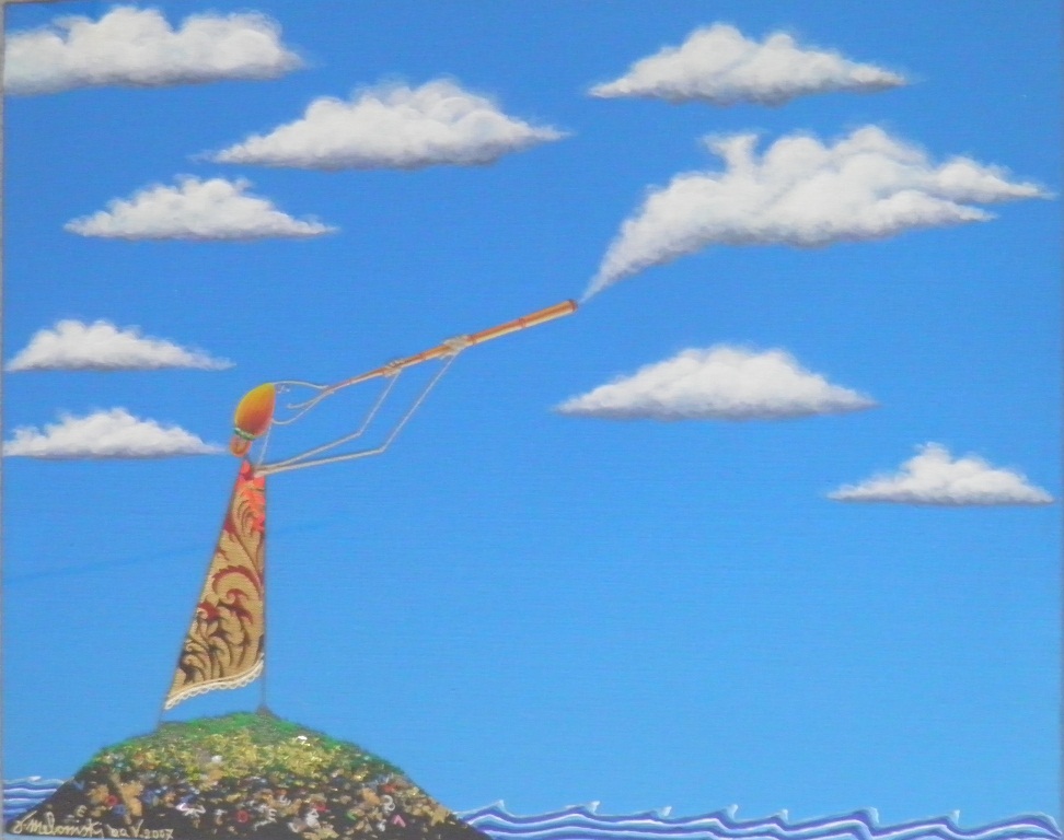 MELONISKI . VILLACIDRO 1943 LA FABBRICANTE DI NUVOLE, 2007 TECNICA MISTA SU TELA cm 46 x 55 Firma e anno a sinistra Firma, titolo, anno e numero archivio (G. 1036/F) al retro Opera dentro teca in plexiglass