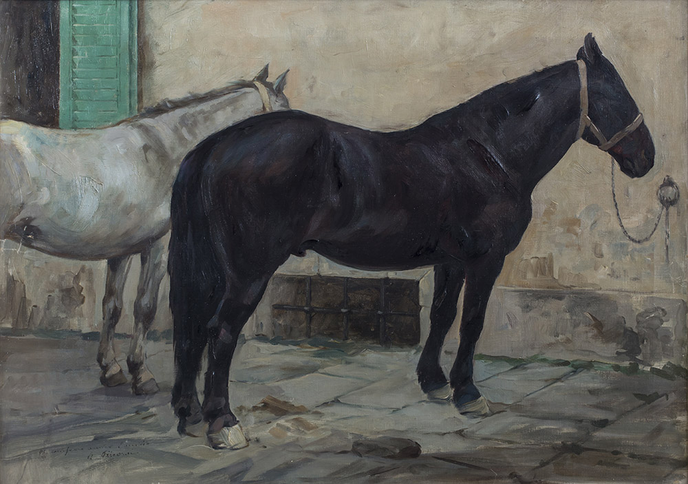 RUGGERO PANERAI (1862-1923)Cavalli in scuderia Olio su telaCm 50x70Firma e...