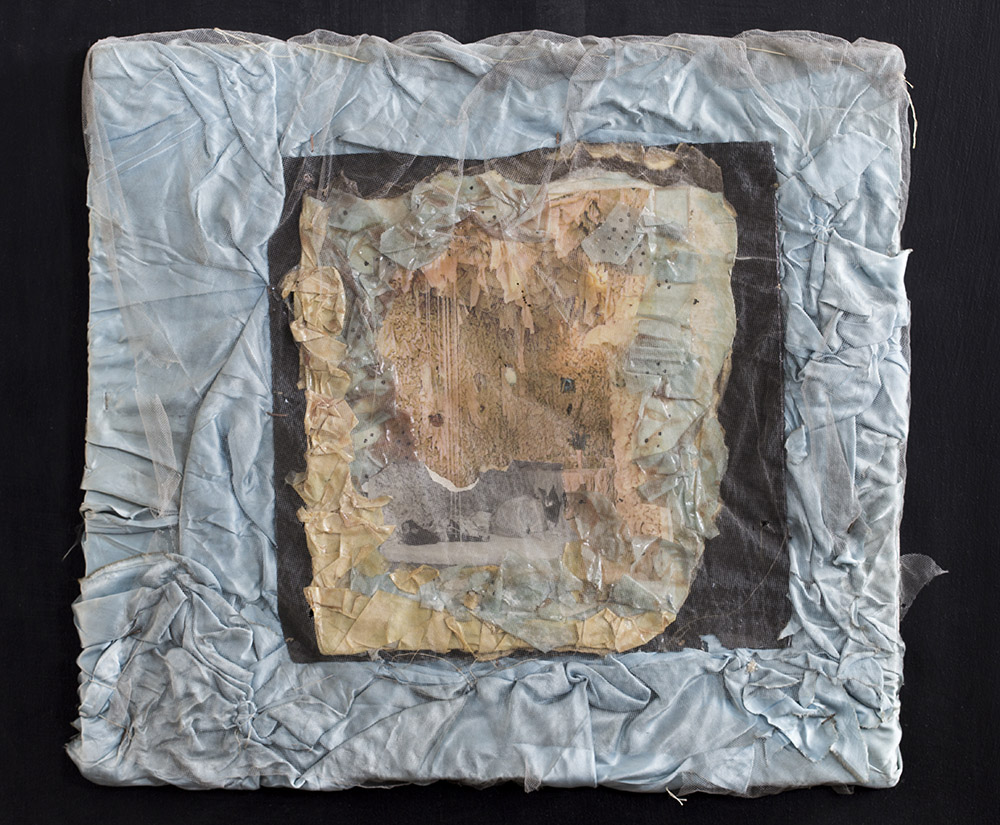 Collage, applicazioni e tela emulsionata applicata su compensato