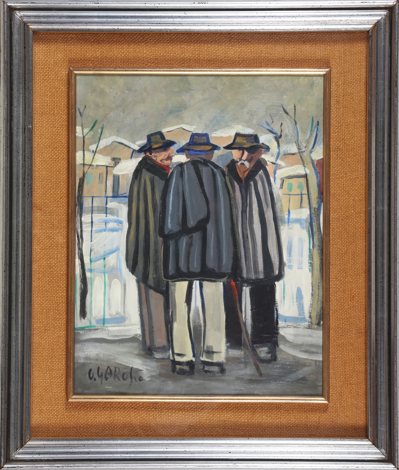 GAROSIO OTTORINO (1904 - 1980) Tre figure. Olio su masonite. Cm 35,00 x 47,00. Firma in basso a sinistra. Cornice presente