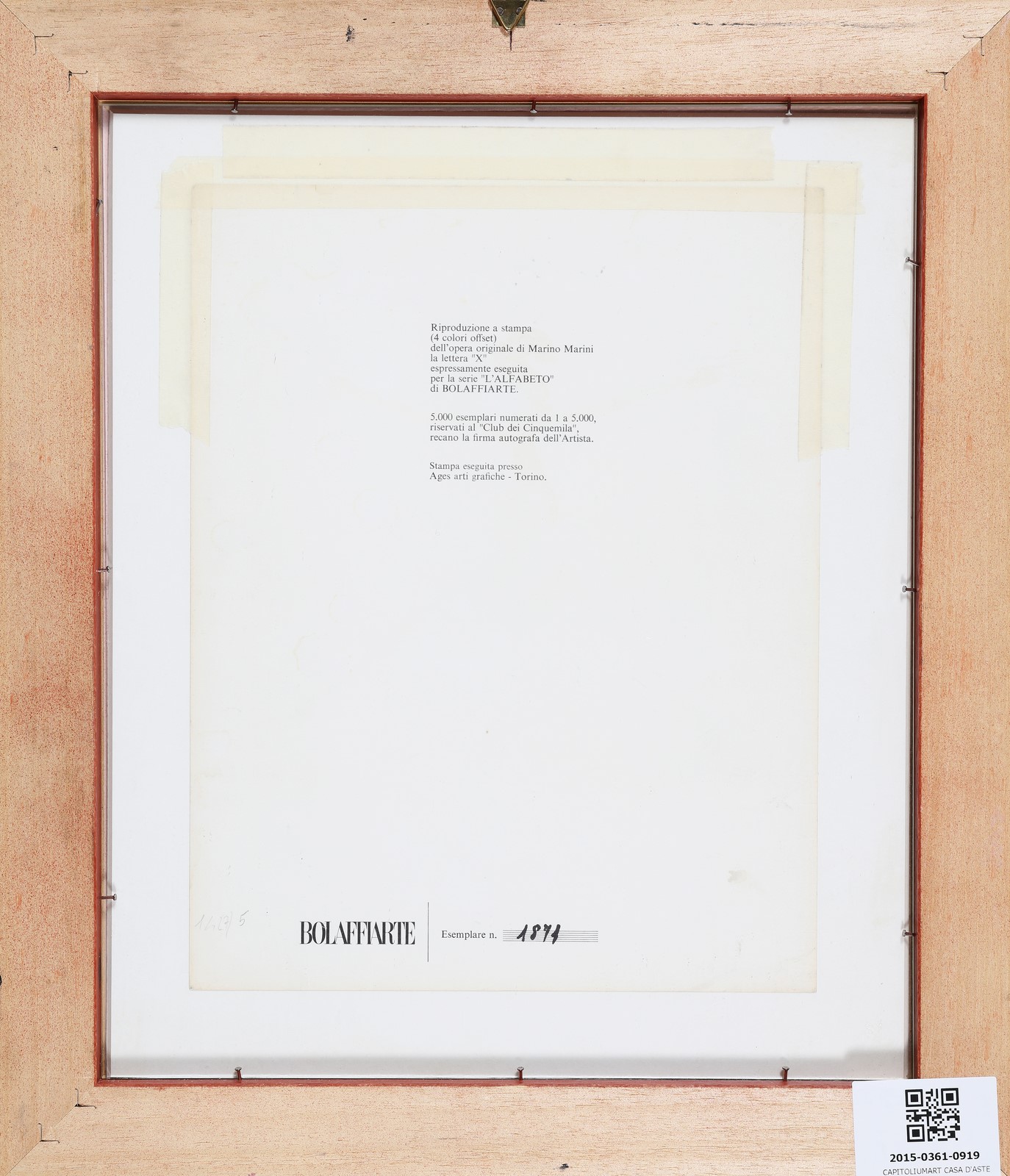 MARINI MARINO (1901 - 1980) La lettera X. offset a colori. Cm 23,00 x 30,00. 1871/5000. Firma monogrammata in basso a destra. Riproduzione a stampa dell'opera originale di Marino Marini la lettere X per la serie L'alfabeto di Bolaffiarte. 5000 esemplari numerati da 1 a 5000 recano la firma dell'artista. Stampa eseguita presso Ages Arti Grafiche, Torino. Al retro cartiglio descrittivo a cura di Bolaffiarte. Cornice presente