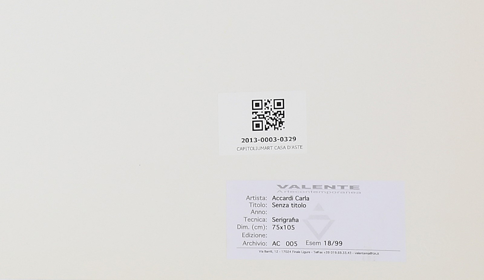 ACCARDI CARLA (n. 1924) Senza titolo. Serigrafia. Cm 105,00 x 75,00. 18/99. Dimensioni lastra: cm 51x76. Timbro a secco - Stamperie Carafiser, Roma - in basso a sinistra. Firma e tiratura in basso a matita.