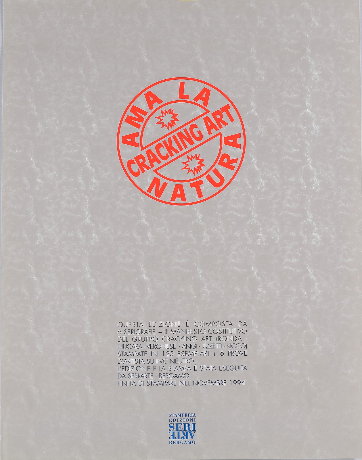 CRACKING ART GROUP (n. 1993) Cartella completa. Grafica. Cm 70,00 x 90,00. Questa edizione è composta da 6 serigrafie più il Manifesto costitutivo del gruppo Cracking Art, stampate in 125 esemplari + 6 p.d.a. su PVC neutro. L'edizione e la stampa è stata eseguita da Seri - Arte, Bergamo. Fine stampa Novembre 1994. 93/125. Ogni grafica riporta la stessa tiratura e timbro a secco Seri Arte, Bergamo in basso a sinistra e firma in basso a destra. Presente confezione originale.