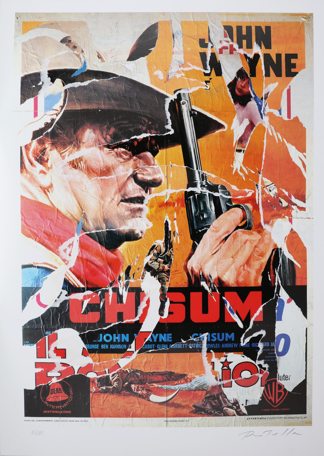 ROTELLA MIMMO (1918 - 2006) Chisum. Litodecollage. Cm 70,00 x 100,00. 13/125. Tiratura e firma a matita in basso. Timbro a secco Fondazione Mimmo Rotella, Milano in basso a sinistra. Pubblicazione: Mimmo Rotella - Multiples décollages, Silvana Editoriale, 2005, pag. 61.