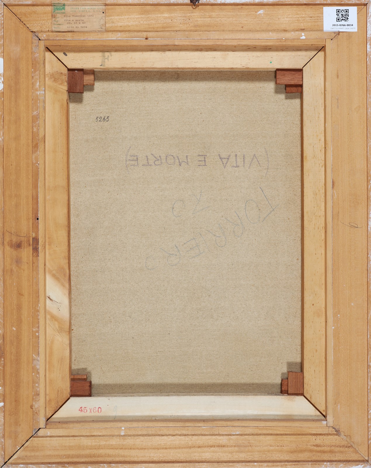 TORRIERO ELIO (n. 1945) Vita o morte. 1970. Tecnica mista su tela. Cm 45,00 x 60,00. Firma e anno al centro. Al retro firma, titolo e anno. Cartiglio descrittivo e timbro a cura della Galleria d'Arte Moderna Viotti, Torino. Cornice presente