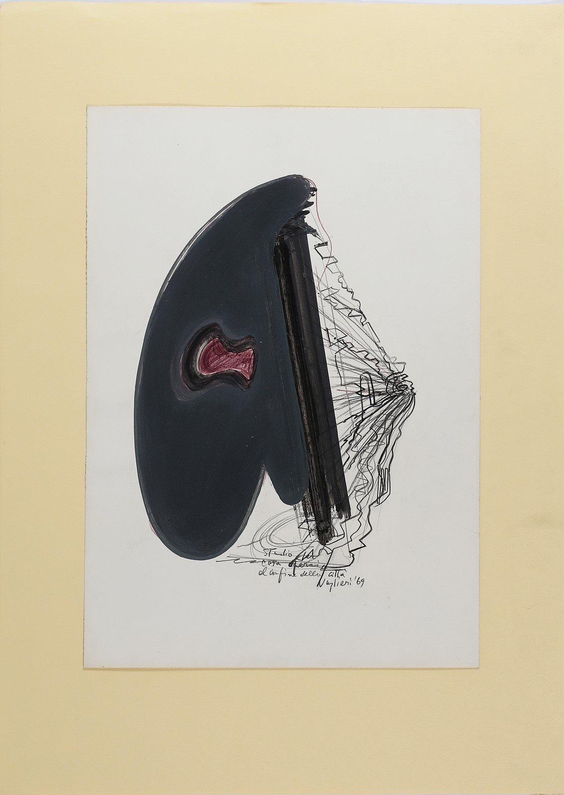 VAGLIERI TINO (1929 - 2000) Studio per casa operaia al confine della città. . 1969. Tecnica mista su carta. Cm 35,00 x 50,00. Titolo, firma e anno in basso a destra.
