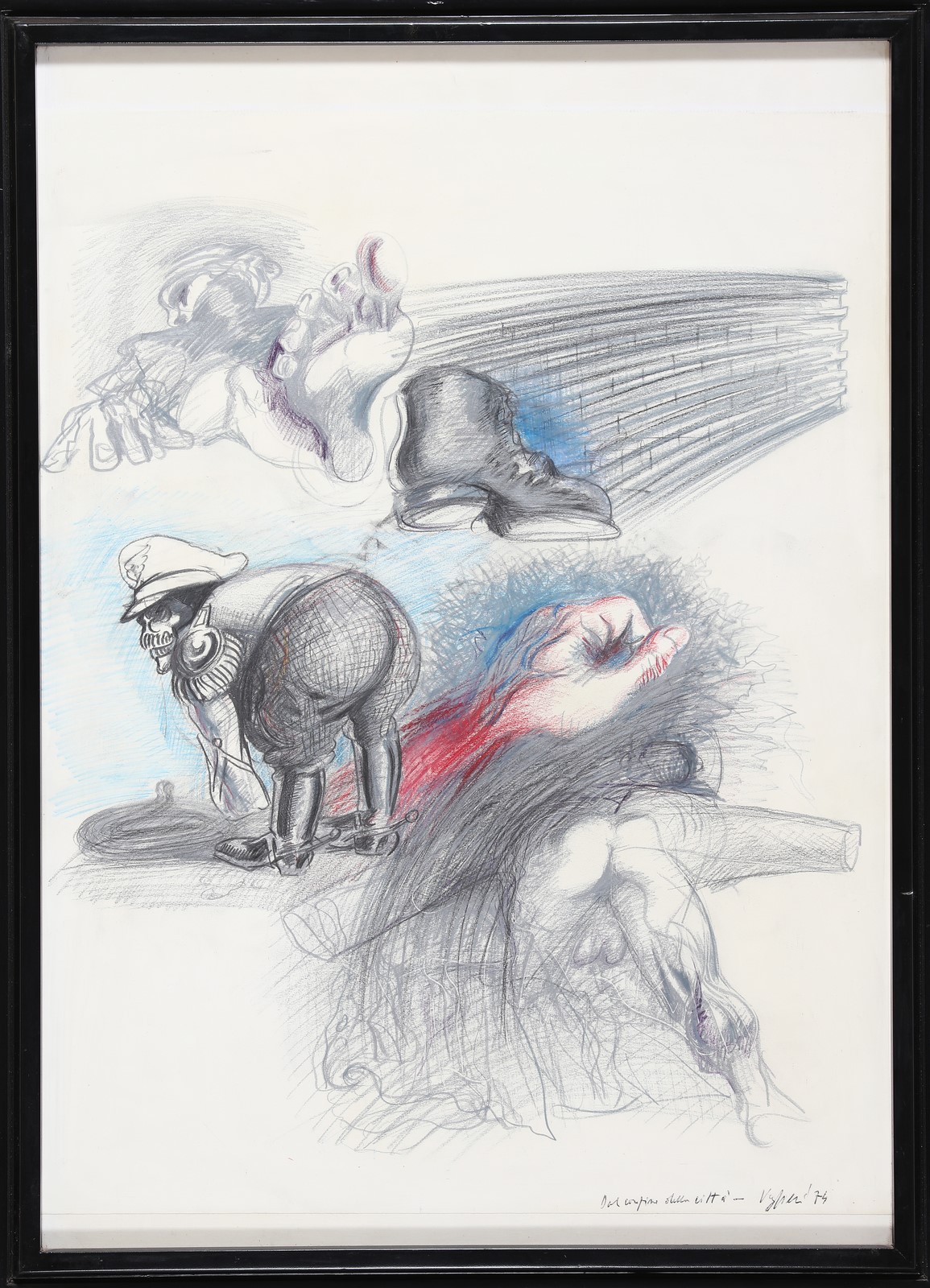 VAGLIERI TINO (1929 - 2000) Dal confine della città. . 1974. Tecnica mista su carta. Cm 62,00 x 48,00. Titolo, firma e anno in basso a destra. . Cornice presente