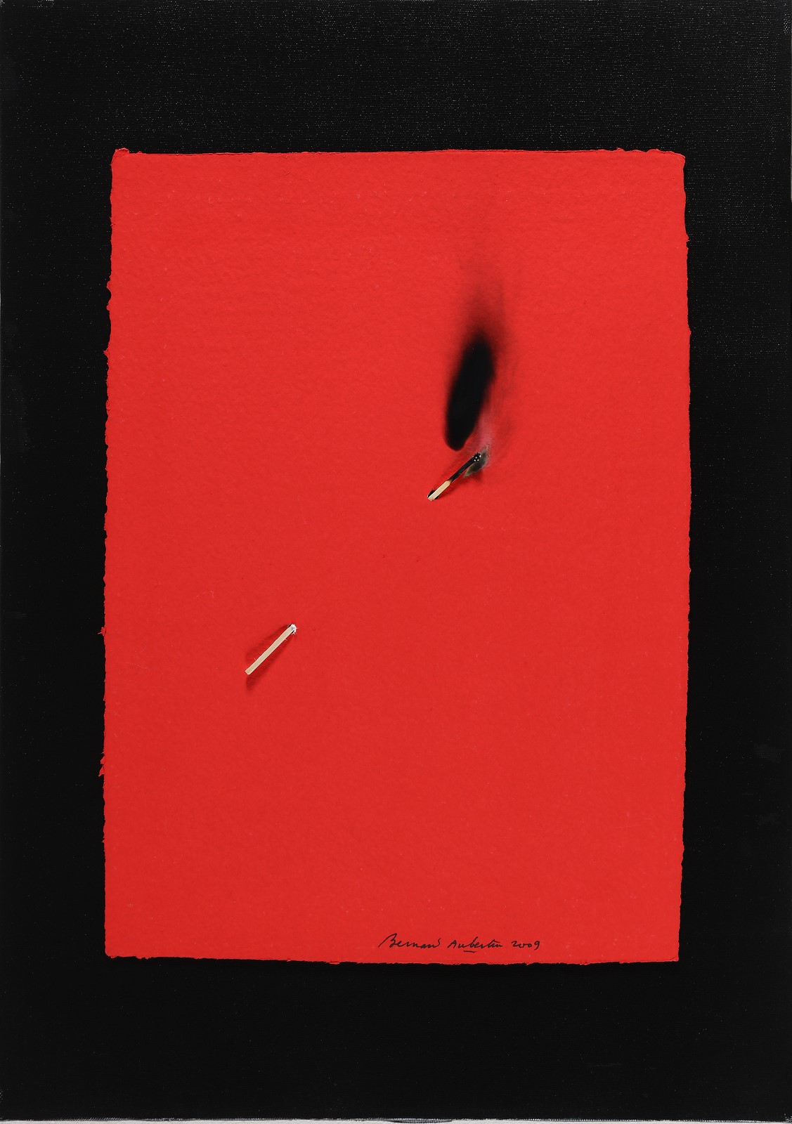AUBERTIN BERNARD (n. 1934) Papier Rouge Brulé. 2009. Fiammiferi bruciati su carta. Cm 36,00 x 50,00. Firma e anno in basso a destra. Autentica dell'artista su fotografia a cura dell'Archivio Nordest, Seregno riportante il relativo numero d'inventario. Pubblicazioni: Bernard Aubertin - Dessins de Feu sur Papier a cura dell'Archivio Nordest, Seregno, testi di Flaminio Gualdoni, Piazza Dante Editore, 2012, pag. 32, tav.32.